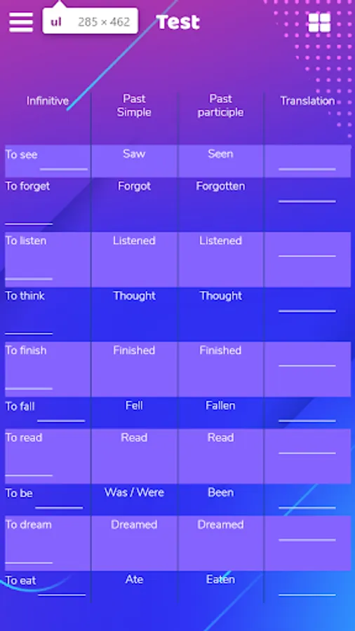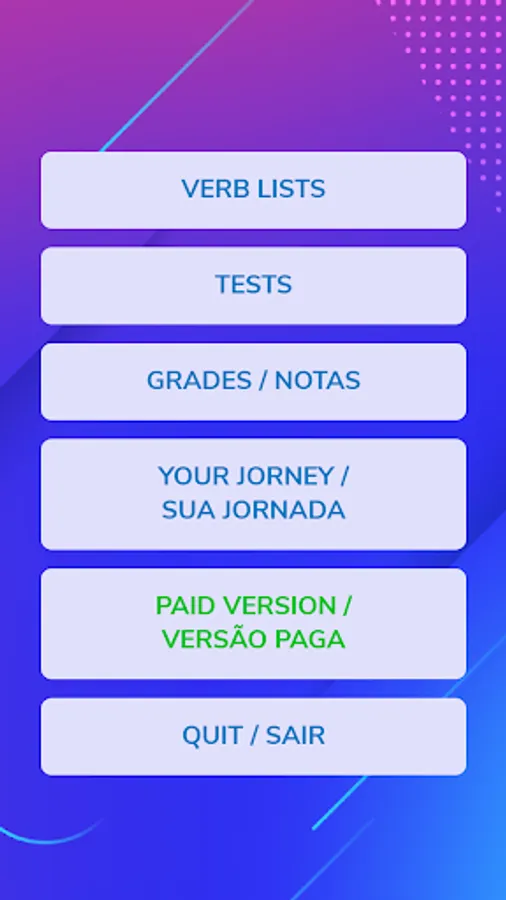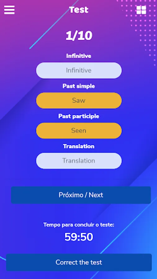 Welbe App is the application that generates proofs of English verbs. The first version has 330 verbs, divided into six levels (from beginner to advanced). A part of the beginner level comes unlocked for you and to release the rest or other levels, you must complete missions that consist of performing verbs tests and getting a minimum grade to test your translation skills, infinitive, simple past, past participle and one mix of all of these.