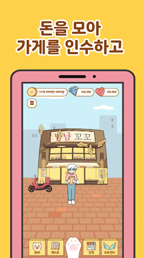 When you touch the screen on the street, Chunbae promotes by distributing flyers in front of the store. Chunbae can win money by promoting flyers. Also, if you promote flyers, you can meet various special passers-by who react to the promotion on the street.