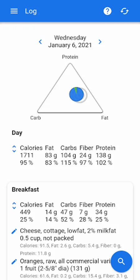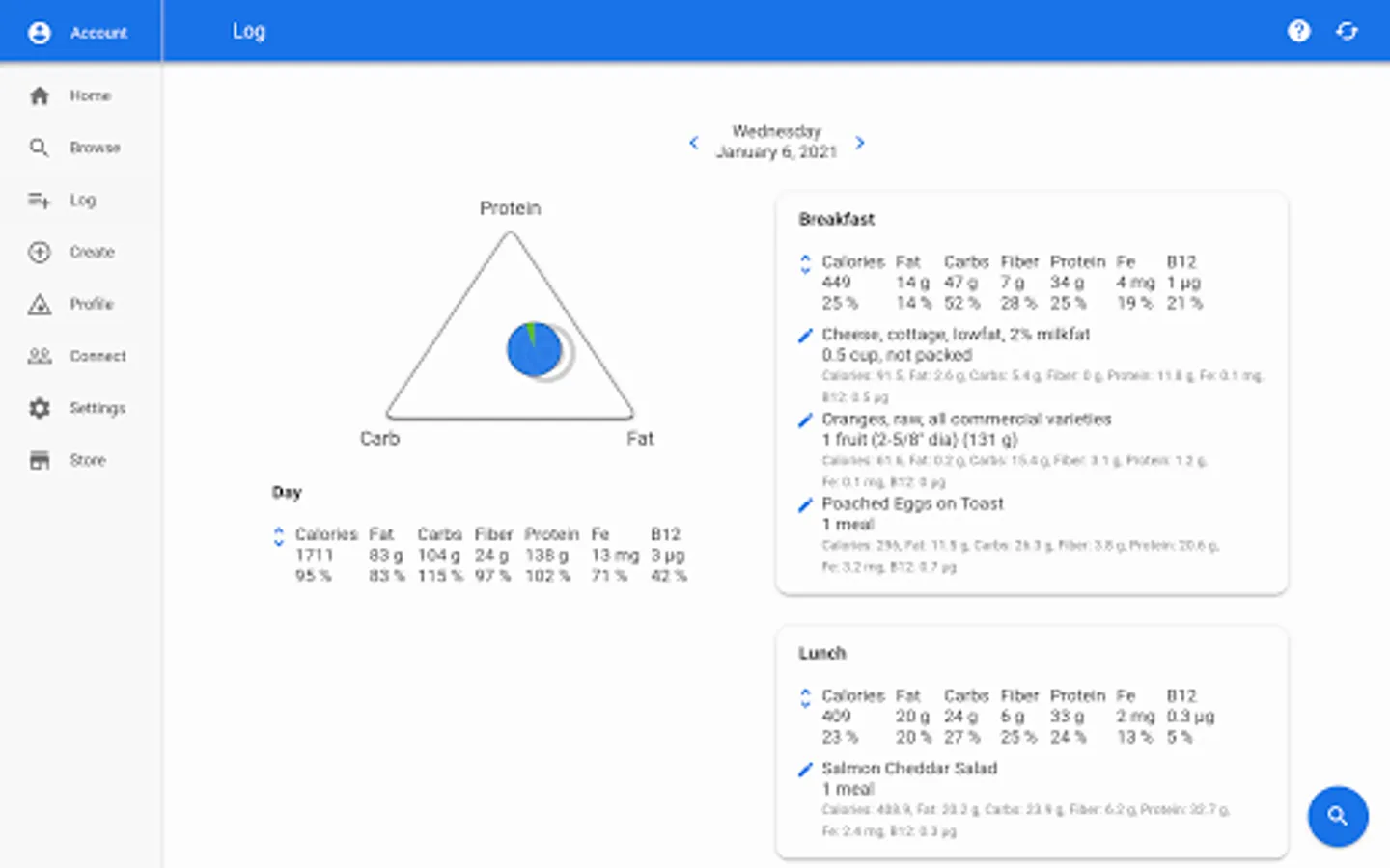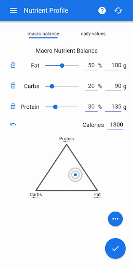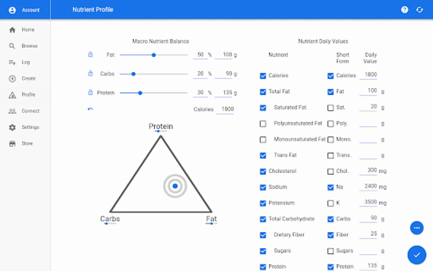 Your personal nutritional profile is used to display nutrient summaries throughout the application. Customize your profile to help track your daily intake. Balance your calorie, carbohydrate, protein and fat intake with the simple macro nutrient balancer. The nutrients in the profile are based on the same nutrients and daily intake values that are used for food labels in the United States and Canada. Your daily intake values can be customized to meet your needs.