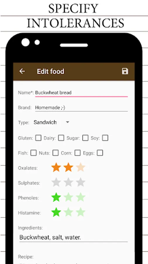 - Add your meal along with specifying intolerances, levels of an often avoided compounds and insight to diet statistics.