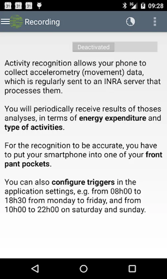 Please note that WellBeNet works correctly on Android phones for which the accelerometer needs to stay active when the phone is sleeping. A compatibility check is executed during the first launch, and models known not to work correctly are reported via Google Play. If your phone does not work correctly, please send us an email to let us update the list of incompatible devices.
