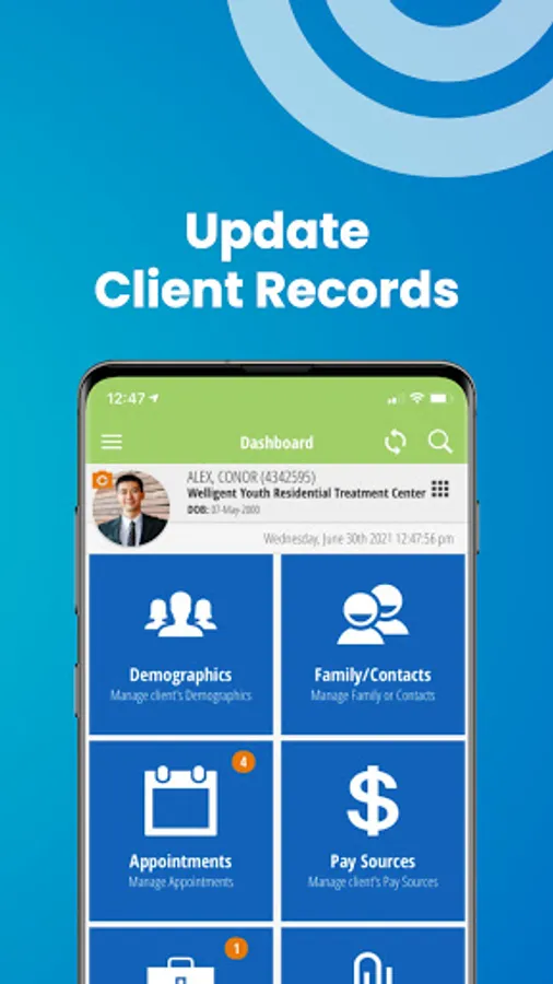 • Access existing client records and add or update demographic and family contact information, pay sources, and medications
