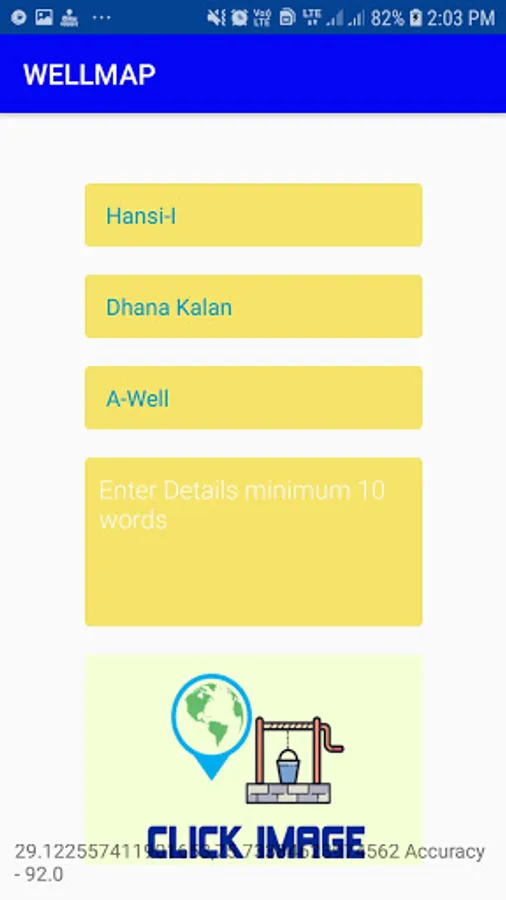 WELLMAP IS DESIGNED AND DEVELOPED FOR FINDING AND MAP THE DIFFERENT AREA BORE WELL WITH GEO TAGGING METHOD, HERE WE ARE CAPTURING AND MARKING THE COORDINATES OF THE WELL AND DEFINED THE CONDITION OF THE MAPPED WELL.