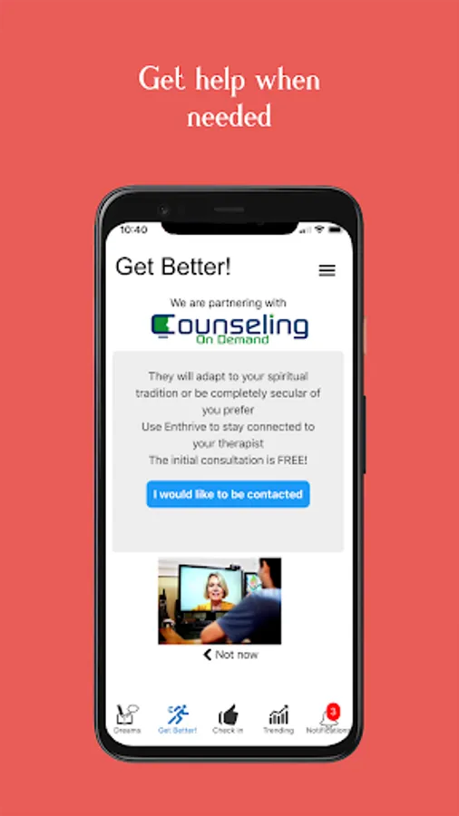The Enthrive app is free to download and use. There are no in-app purchases. It can be used in conjunction with services from Counseling on Demand. Learn more by tapping the Get Better! icon and then Connect. They offer a free initial consultation.