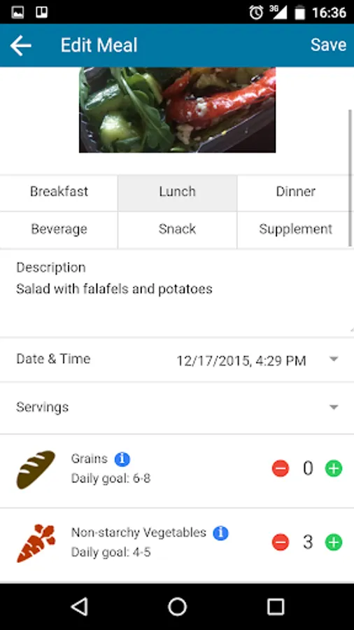 Tracking servings has never been easier. Just snap a picture and tap the serving amount. No looking up food; no entering grams and calories. No more looking up one food type from hundreds of examples. And MealLogger lets you know how you're doing, meal by meal, how many more servings you need to eat that day.
