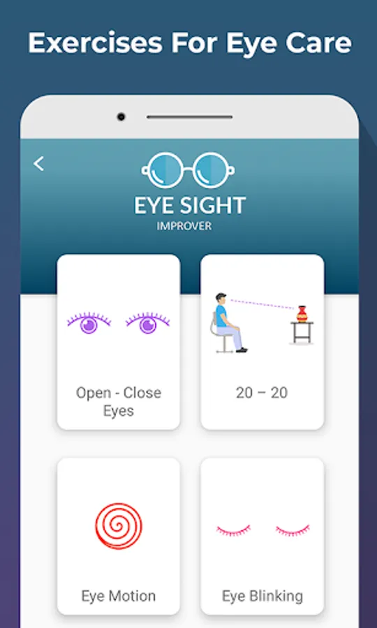 Eye Care can be best done through eye exercise; Eye Care: Eye, Test, Exercise & Blue Light Filter app introduces some very basic yet effective eye exercises that are crucial for eye care. The eye exercises included are,