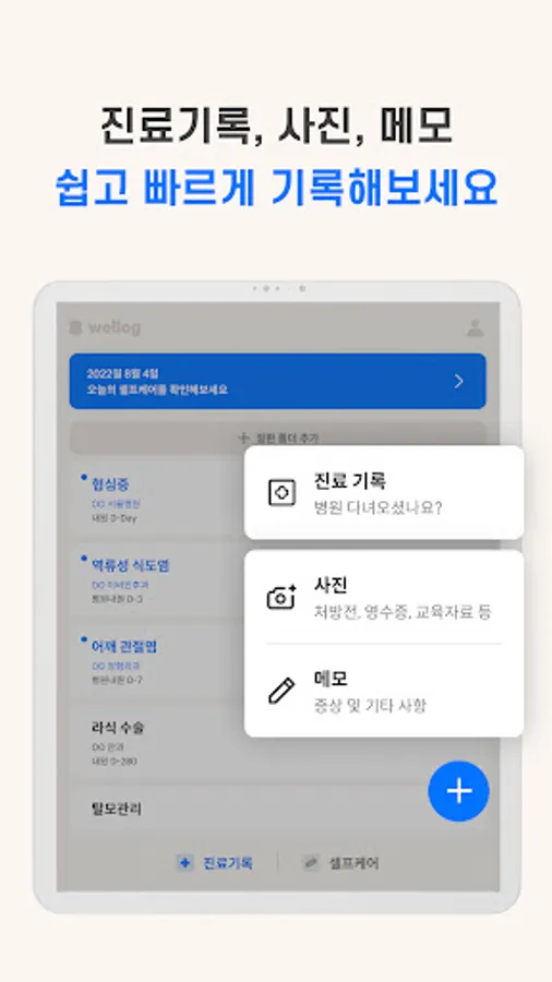 Directly record and manage symptoms, medications, levels, PRO, and exercise self-care items.