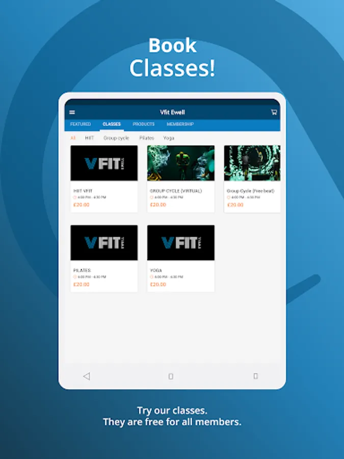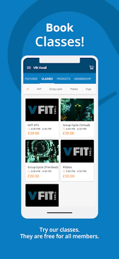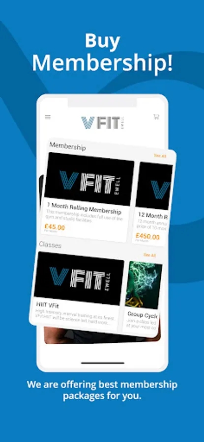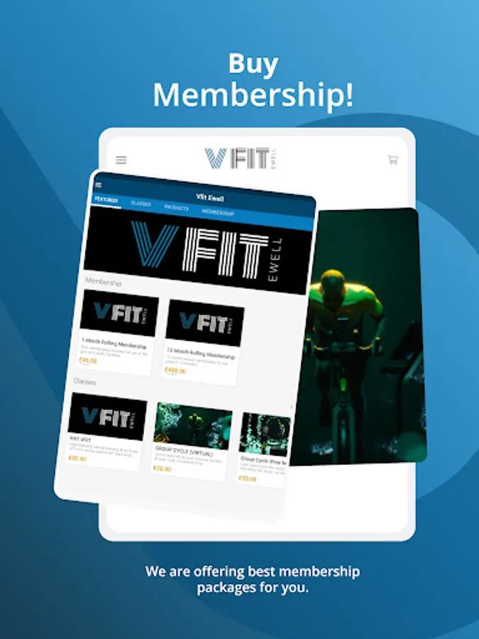 Vfit Ewell app features include access control (entering Vfit), class bookings, membership bookings, updates on club information.