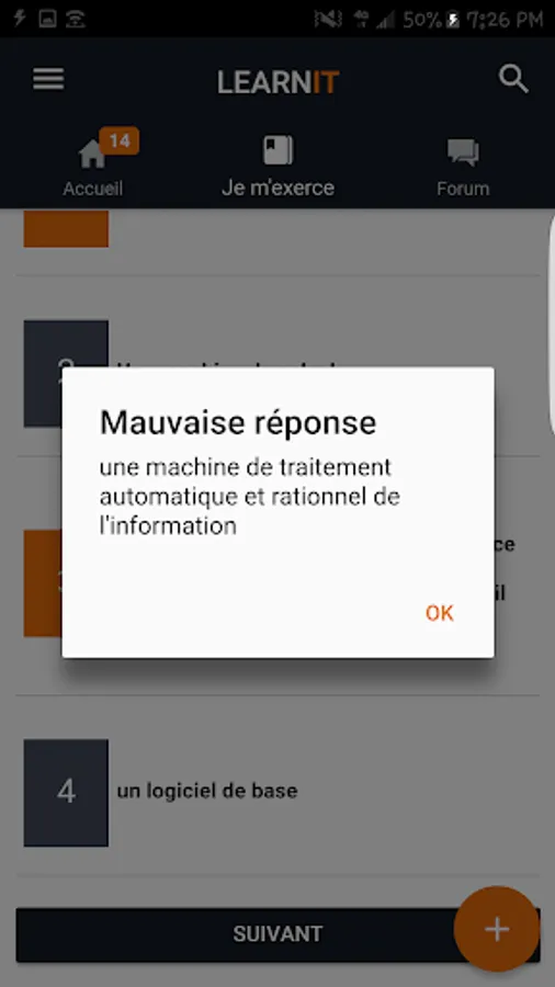 The application offers a section I am exercising where learners can test their knowledge and be immediately corrected.
