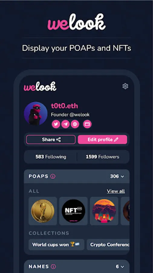 Welook Profile allows users to upload an NFT image or picture as their main avatar, write a brief bio, and add links to other social media accounts. POAPs section works as a proof of web3 interaction and history. Names feature allows users to decide their own name on the platform and connect their web3 domain as their main social profile name.
