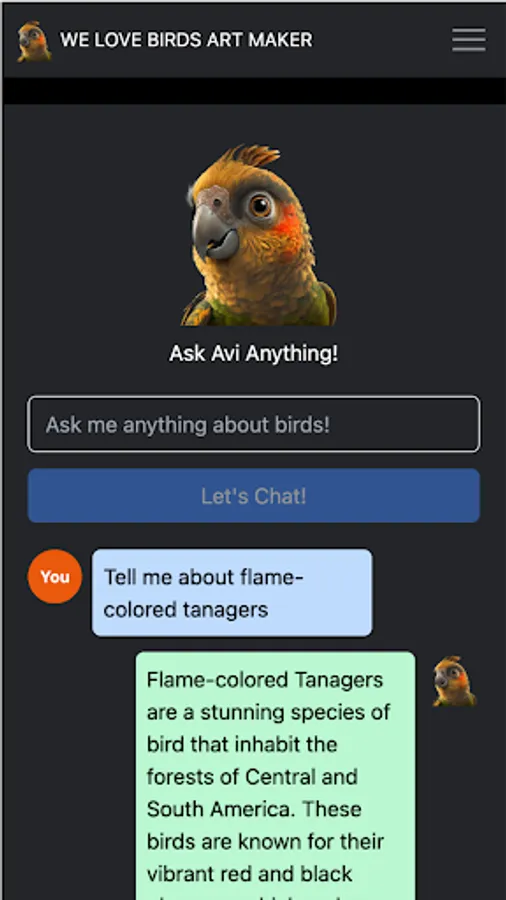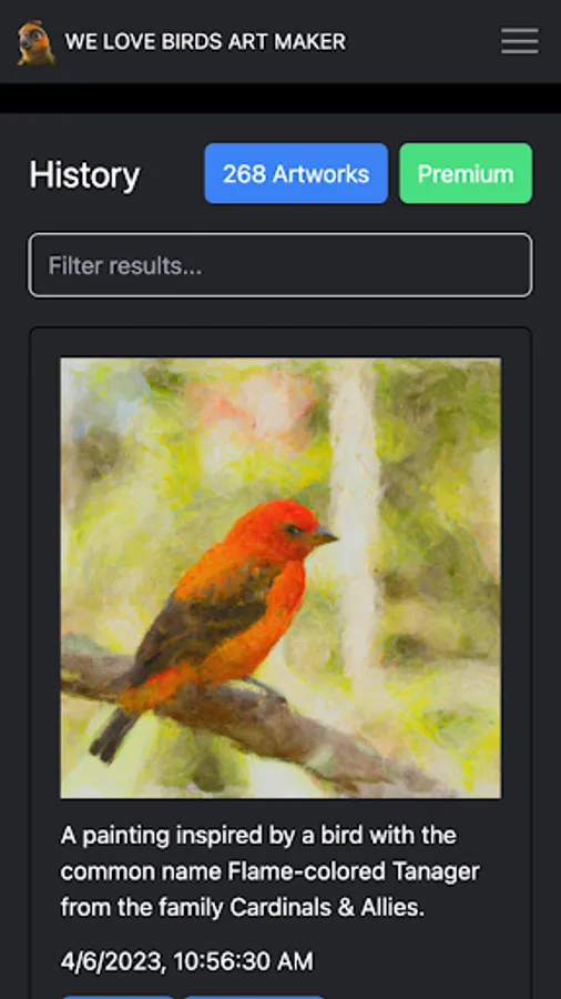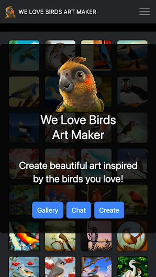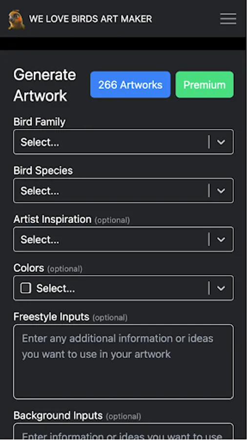 Create unique original bird art. Use AI to inspire your creativity. Share with your friends on social media. Download hires images of your original artworks and use them for cards, gifts and more!