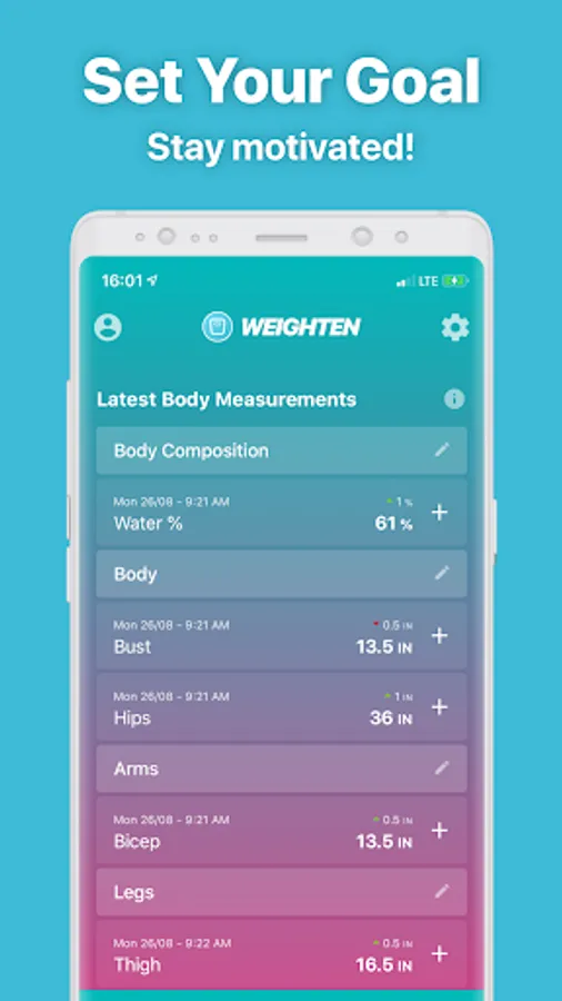 Weighten is designed to help you keep track of your body's progress. Get inspired, set a goal and have accountability with our “Goal setting and tracking” feature. Share your progress on social media with cute graphs and motivational messages. Easily track your weight goals by Login in your weight, setting reminders, and see progress graphs. Track all of your most important body measurements. (Waist, hips, thighs, biceps, body fat percentage). Learn your Body Mass Index (BMI)