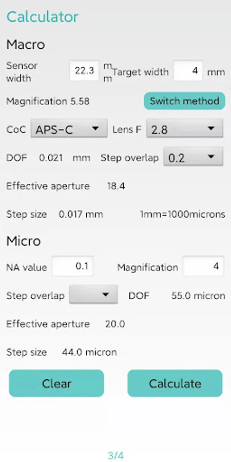 On the third page of the APP, there is a DOF calculator for the macro lens and the microscope objective lens.