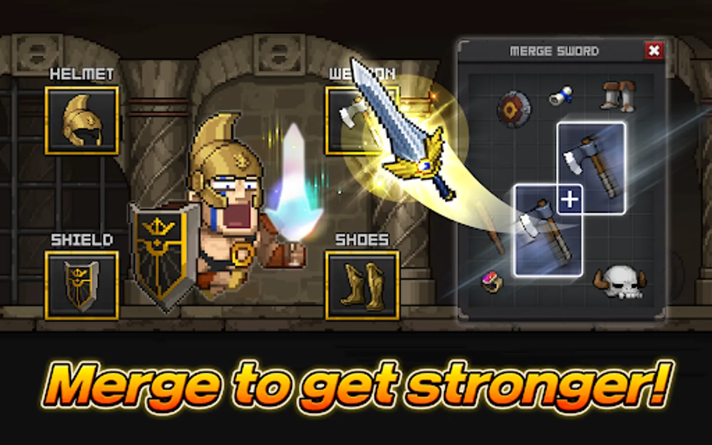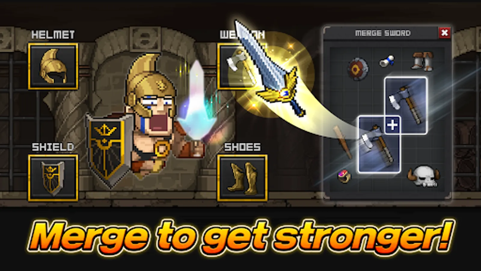 Merge and upgrade the weapons, shields, helms, and boots.