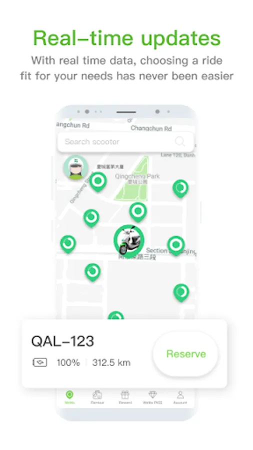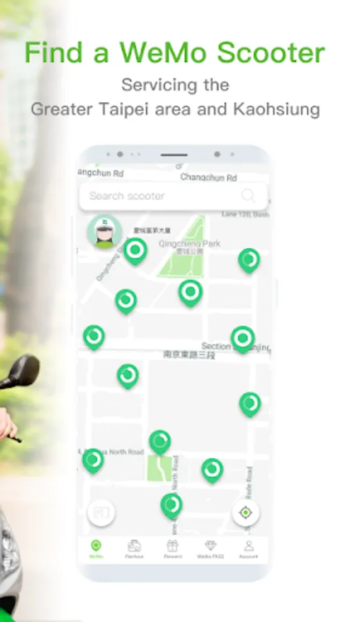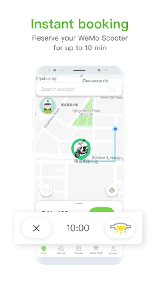 2. Renting:Launch the WeMo Scooter App to find a nearest scooter and reserve it. Turn on your WeMo scooter and open the scooter's trunk, and begin your journey!