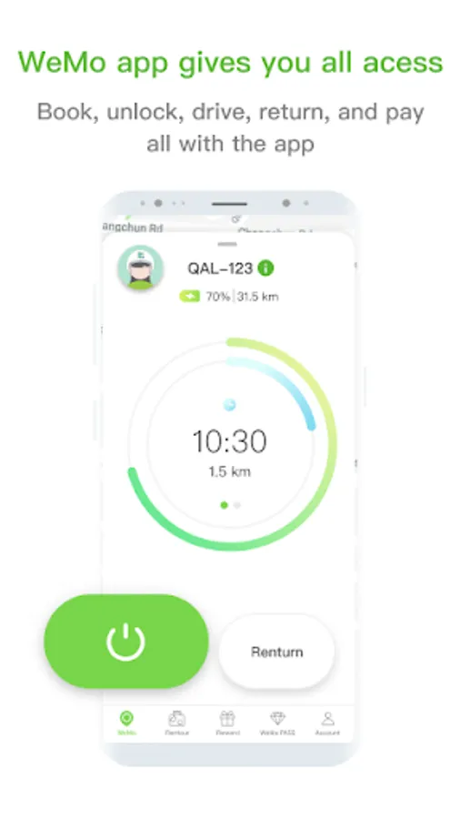 1. Keyless:Your smart phone is the key. Through our app, you can book, rent, turn your WeMo Scooter on and off and even open the trunk.