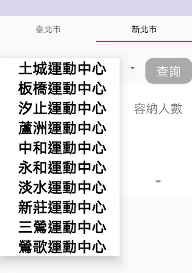 Tucheng Sports Center, Itabashi Sports Center, Xizhi Sports Center, Luzhou Sports Center, Xizhi Sports Center, Zhonghe Sports Center, Yonghe Sports Center, Danshui Sports Center, Xinzhuang Sports Center, Sanying Sports Center, Yingge Sports Center
