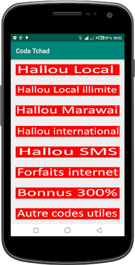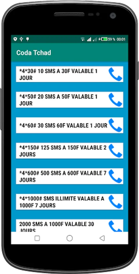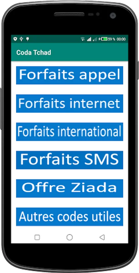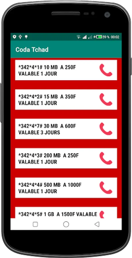 Coda Chad is an application that allows you to use the USSD service of all networks of mobile telephones in Chad, without requiring special efforts to a network. Coda Tchad, you can subscribe to an internet package, subscribe to a local or international calling plan, subscribe to an SMS package, check your main balance, know your number and many more subscriptions.