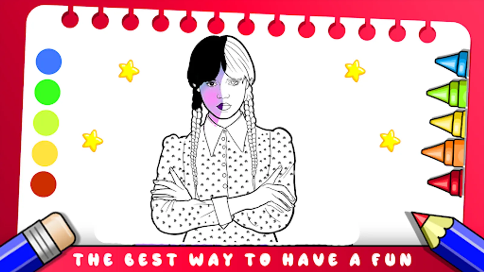 Colors: Wednesday Addams app is a fun and compelling way to de-stress and get creative! The application has high quality pictures and images for you to color, paint and draw on. You can draw some difficult picture or for kids we have some easy coloring page to start drawing. Discover the joy of art and color!