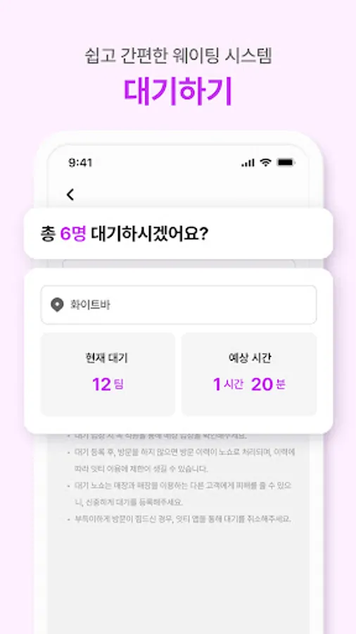 - 앱을 통하여 해당 매장으로 직접 가지 않아도 간편하게 대기할 수 있습니다.