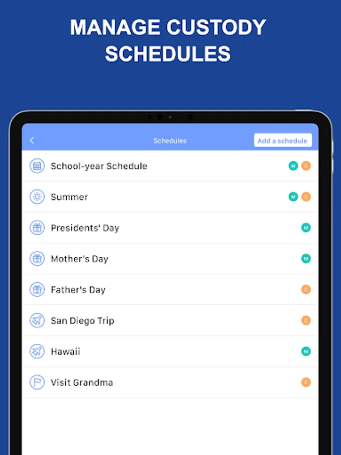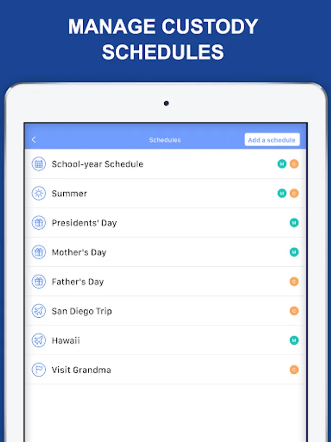 1. Custody schedules. Use WeParent to set up your school year, summer, holiday, travel and vacation schedules. Start from our convenient built-in templates or use a custom schedule. Then track and manage changes to the parenting calendar, so that there is never any confusion about where the kids are staying.