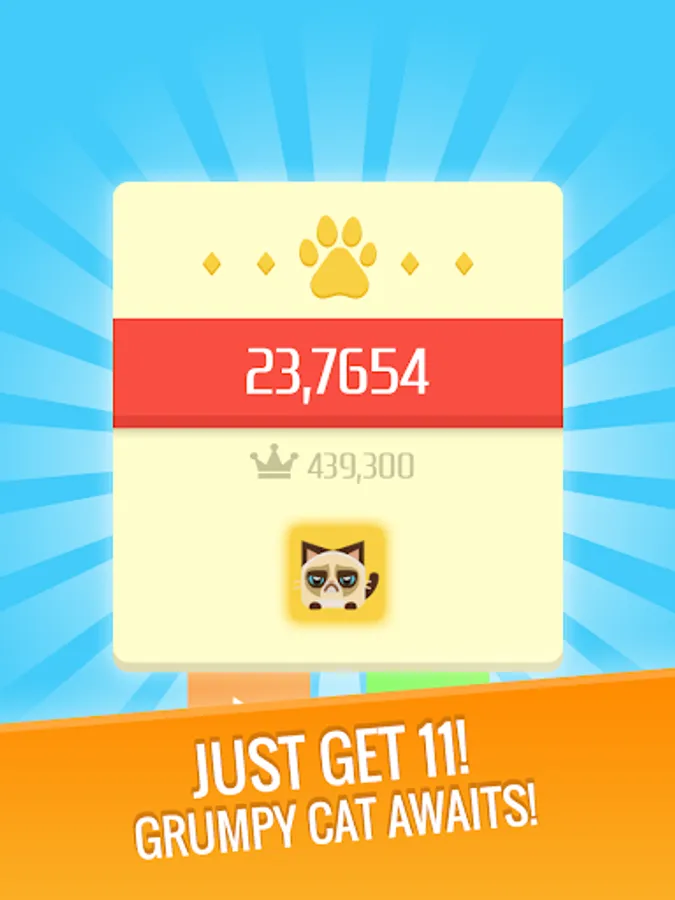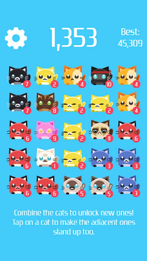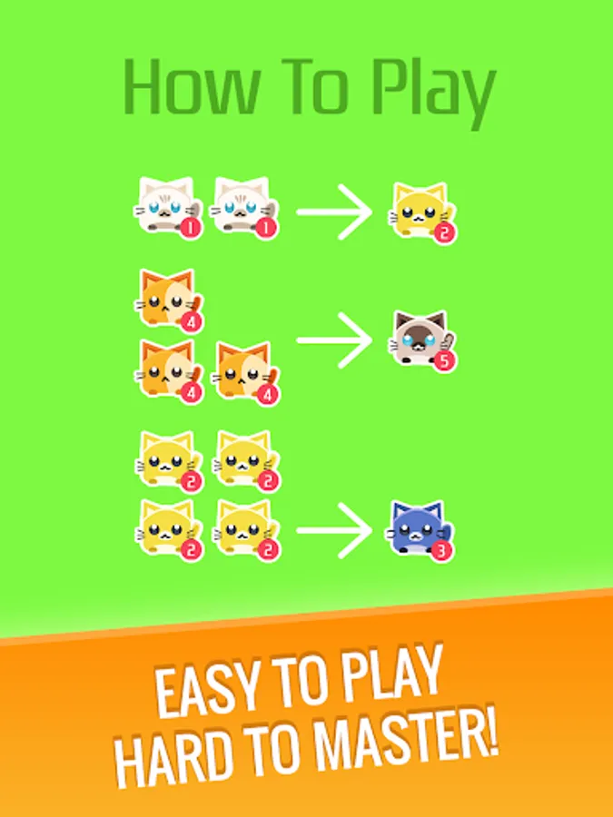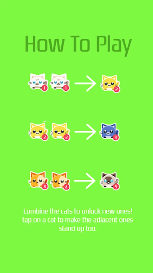 Tap the adjacent cat with same shape, and they will stand up. Tap again, they will join in the position you tap. Try to get grumpy cat, or even higher!