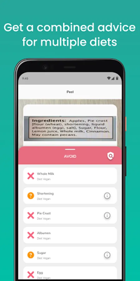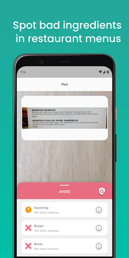 With PEEL SCAN, you can scan the ingredients list on any food label, restaurant menu, or recipe and get an instant answer: "Avoid" or "Safe" based on your food intolerances or allergens you want to avoid (e.g. Gluten, Dairy, Yeast, Fructose, etc.), your dietary considerations (e.g. No Added Sugars, No Artificial Sweeteners, No Harsh Food Colorings, etc.), or a popular diet you follow (e.g. Vegan, Vegetarian, Paleo, Palm Oil Free, etc.).
