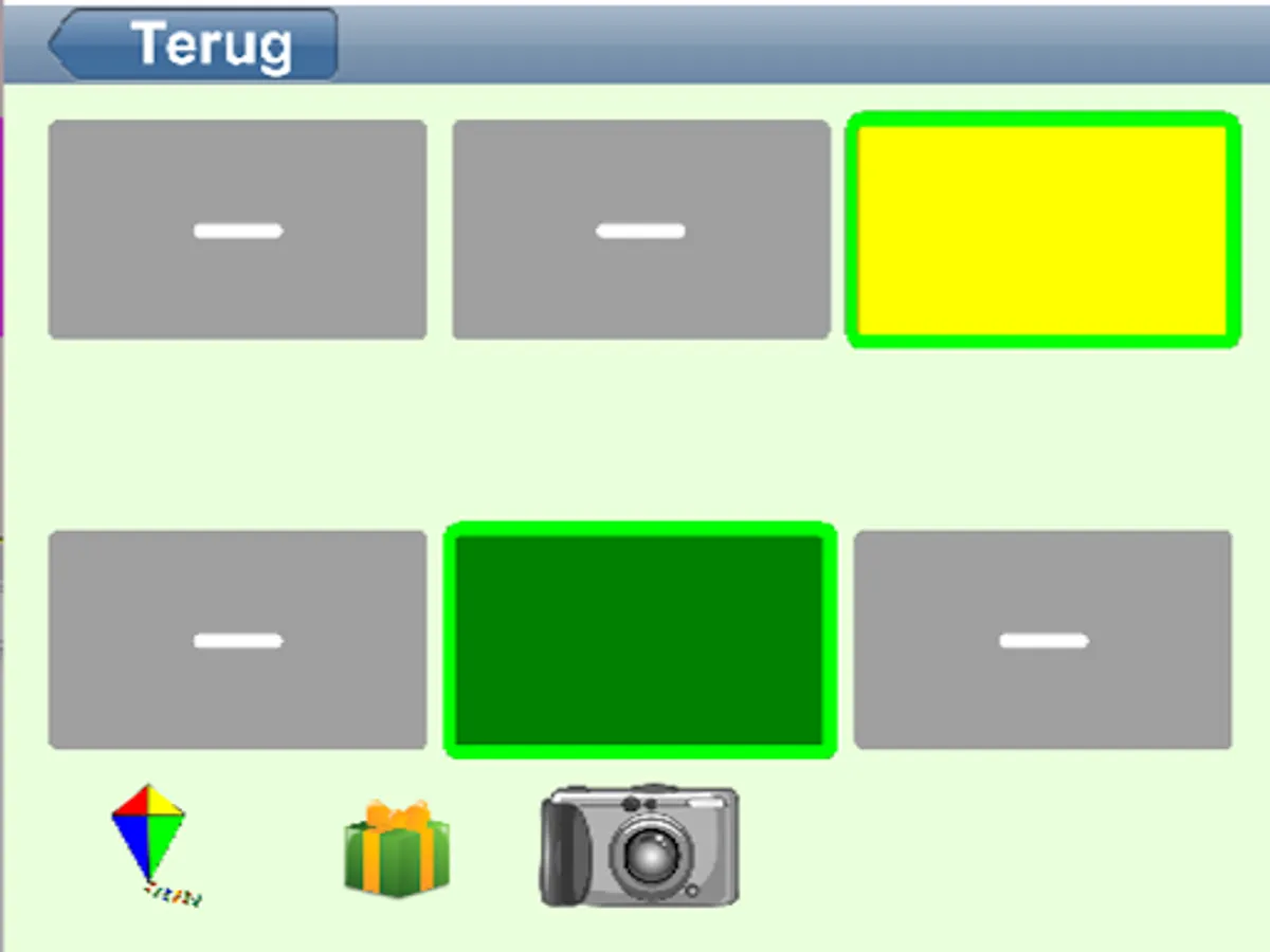 Koppelen in dezelfde kleur - Hogere moeilijkheidsgraad. Alle kaarten hebben dezelfde kleur. Het kind komt alleen overeen met letteridentificatie. Selecteer kaarten met bijbehorend symbool - Zonder hulp van kaartkleur