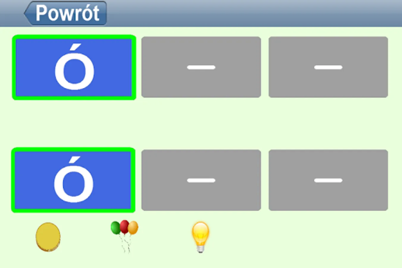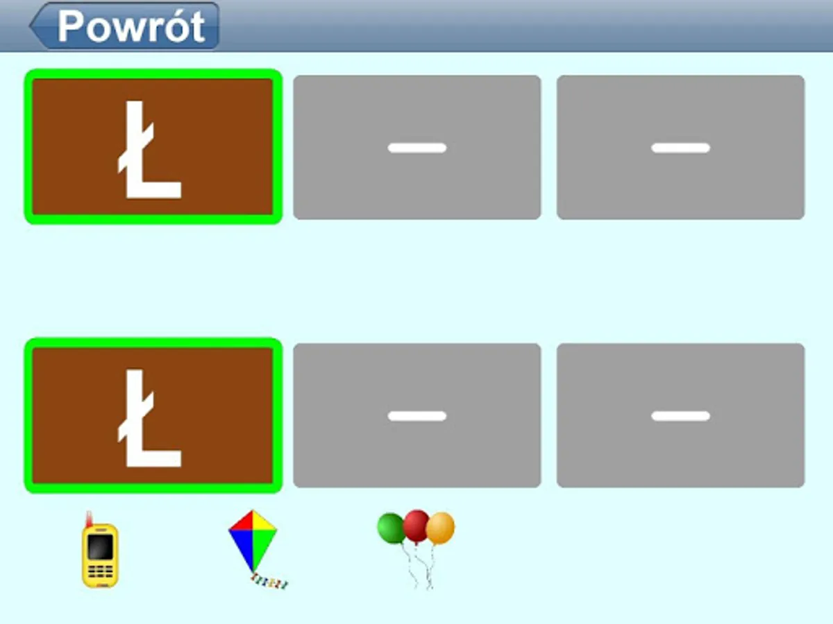 * Rozpoznawanie dźwięków—dziecko wybiera literę z dostępnych. Należy wskazać kartę z prawidłowym symbolem.
