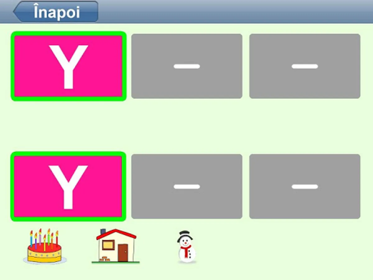 Grupează de aceeași culoare-nivel de dificultate ridicat.Toate cardurile sunt de aceeași culoare.Copilul potrivește doar prin identificarea literei.Selectează carduri potrivind simbolul-Fără ajutorul culorii cardului.