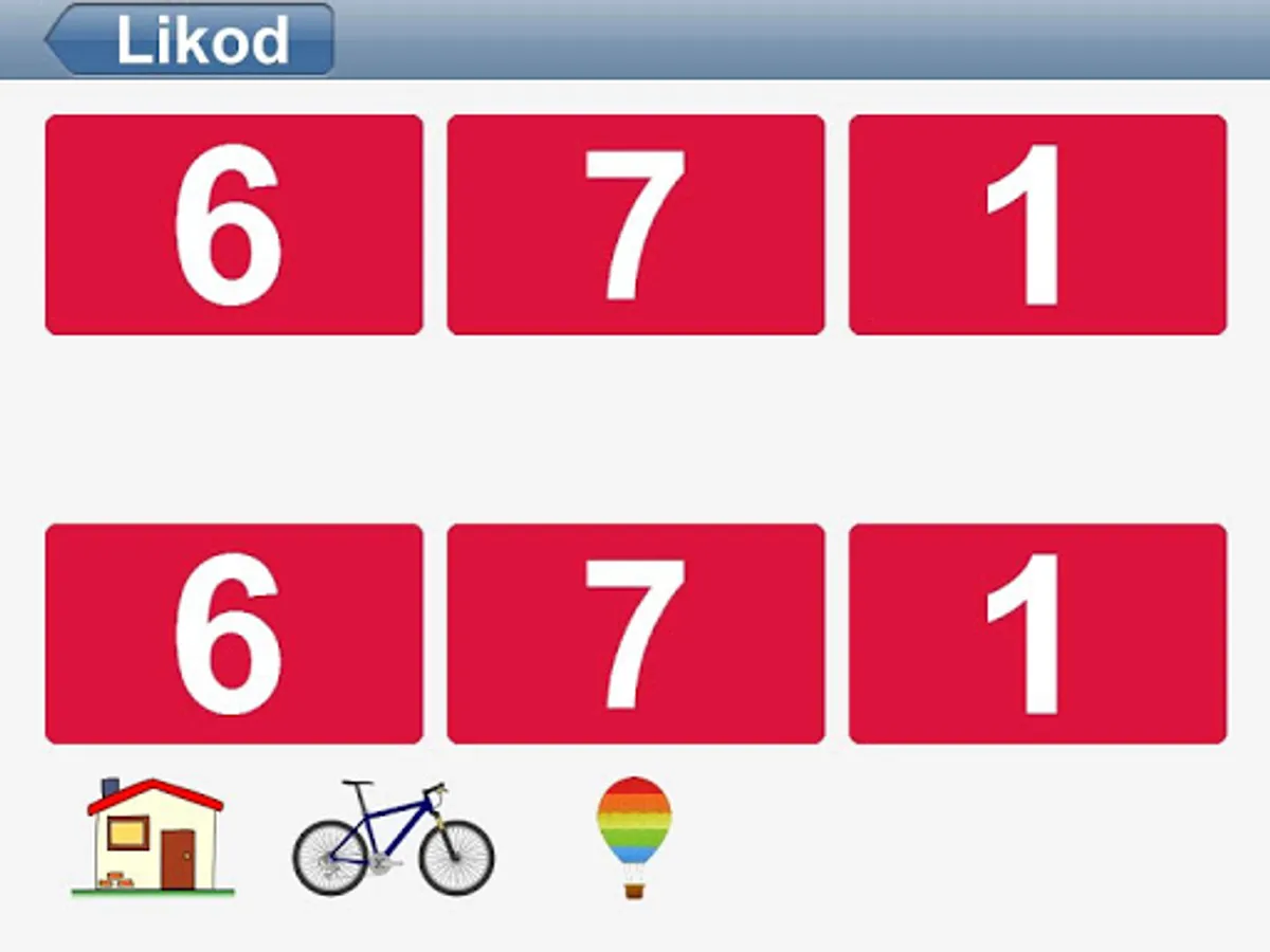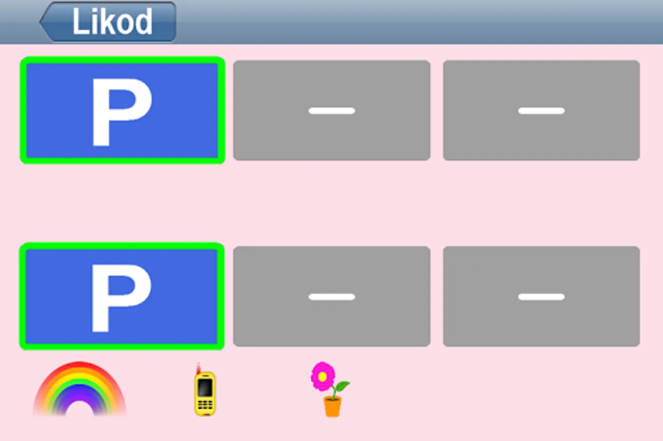 * Ang pagpapares ng magkaparehang kulay- Mas mataas na antas ng pagsubok. Ang lahat ng tarheta at magkasingkulay. Itinutugma lamang ng bata sa pagkilala ng mga letra. Piliin ang tarheta na may magkatugmang simbolo – nang walang tarheta na may kulay.