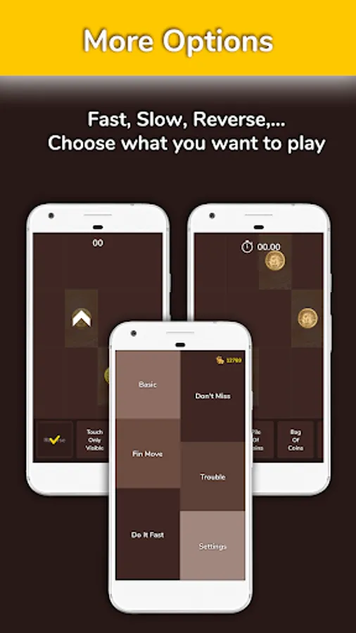• The rule is clear. Tap the tiles which only contains coins and don't miss any coin! Concentrate yourself and maximize your reaction!