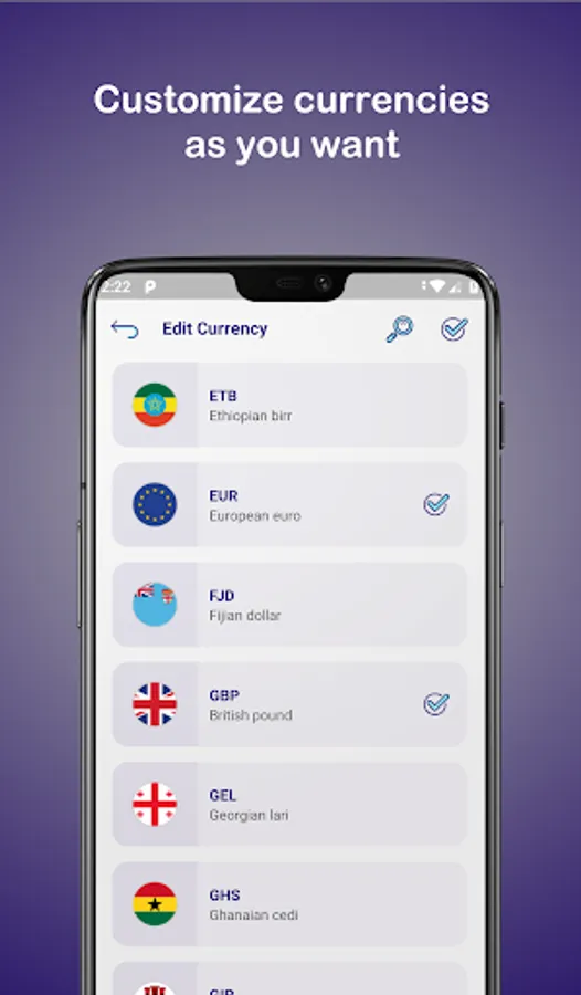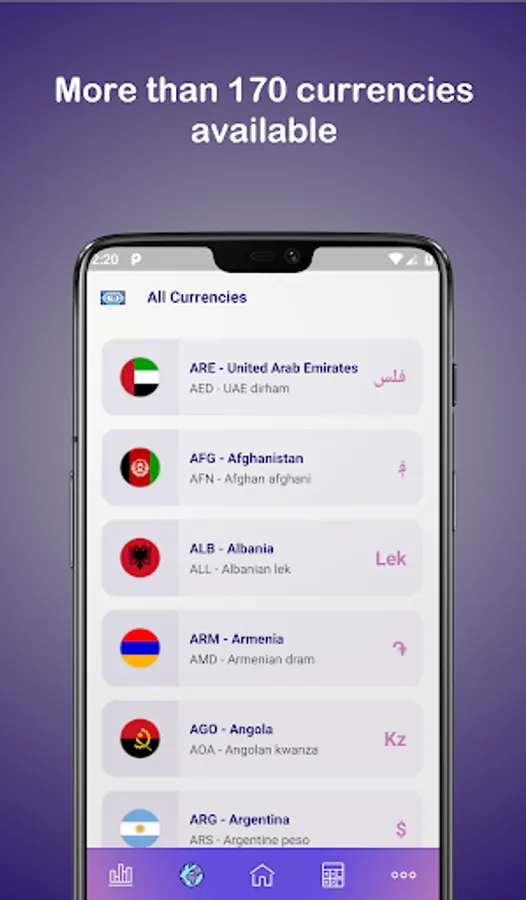Supports currencies for every country including the dollar, euro, pound, yen, yuan, won, franc, ruble, dinar, peso, rupee, shilling, rial, dirham, florin, guinea, krona, krone, riyal, colon and more!