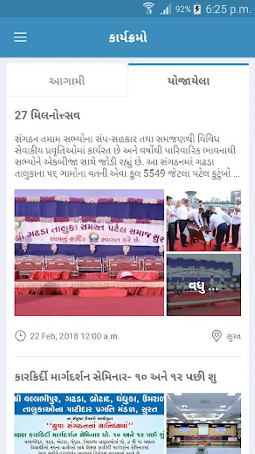 Members of samaj can get information about events that is upcomings or already finished with route of destintiation and also collection of memories in form of images.