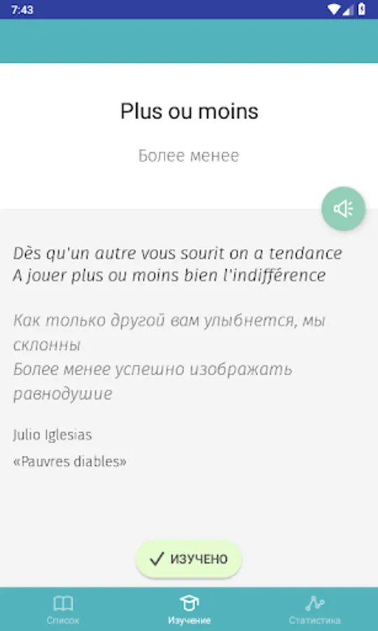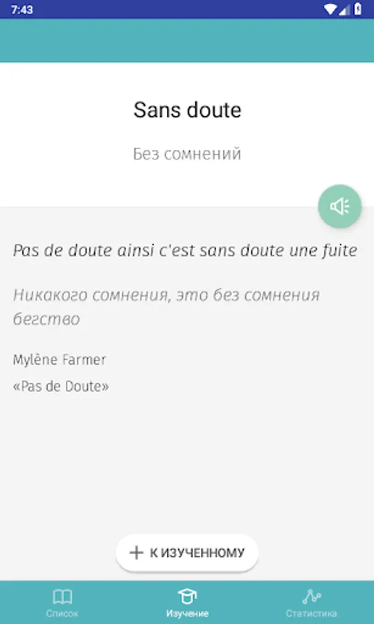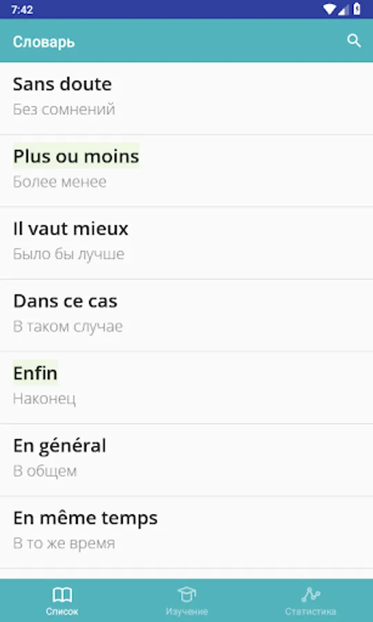 The application is a reference book of the main words-bundles, or introductory words of the French language, with examples of usage from well-known works, literary or musical. You can listen to the pronunciation. For memorization, we use the mechanism of adding words to the "Learned" section.