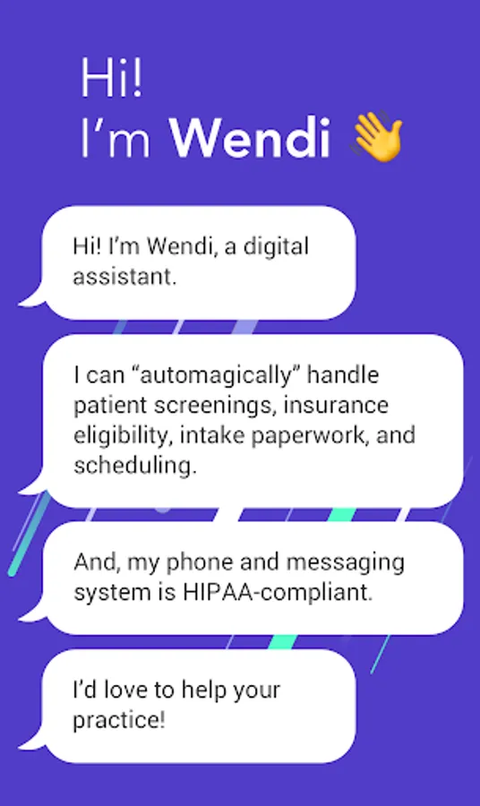 Wendi is the first benefits-aware omnichannel digital assistant designed specifically for healthcare professionals. Wendi can interact with prospective and active patients through web chat, phone (VoIP), and SMS to “automagically” screen new patient inquiries, instantly check insurance benefits, automate intake paperwork, and schedule appointments. Oh! And of course it’s HIPAA compliant.