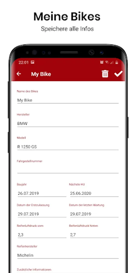 Store the most important data about your bikes, such as chassis number, year of manufacture, next general inspection, tyre pressures and emergency data.