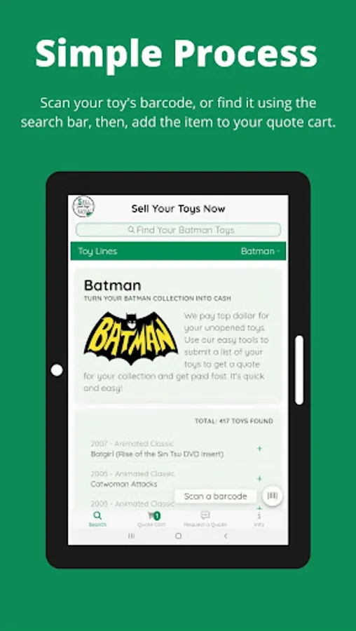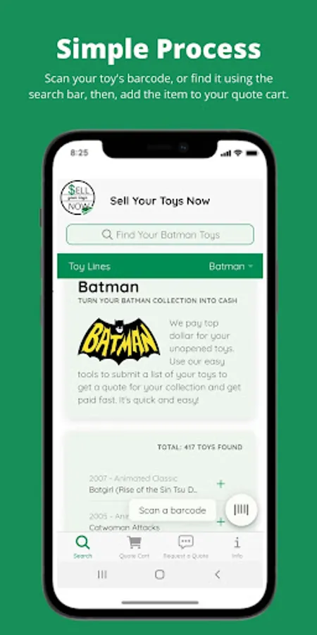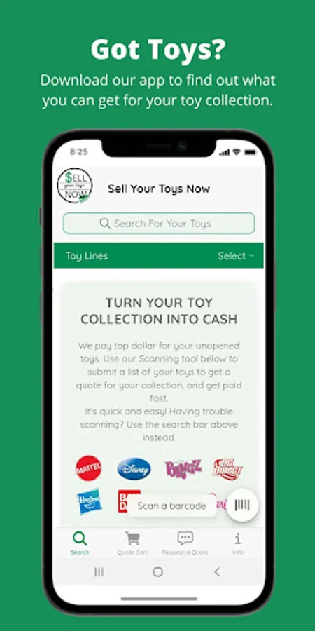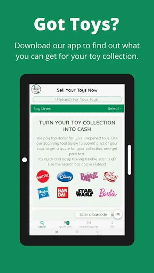 Scan your items, or enter them by name. When you are finished entering all of your toys, simply submit the items for a quote. You will receive a quote within 48 hours.