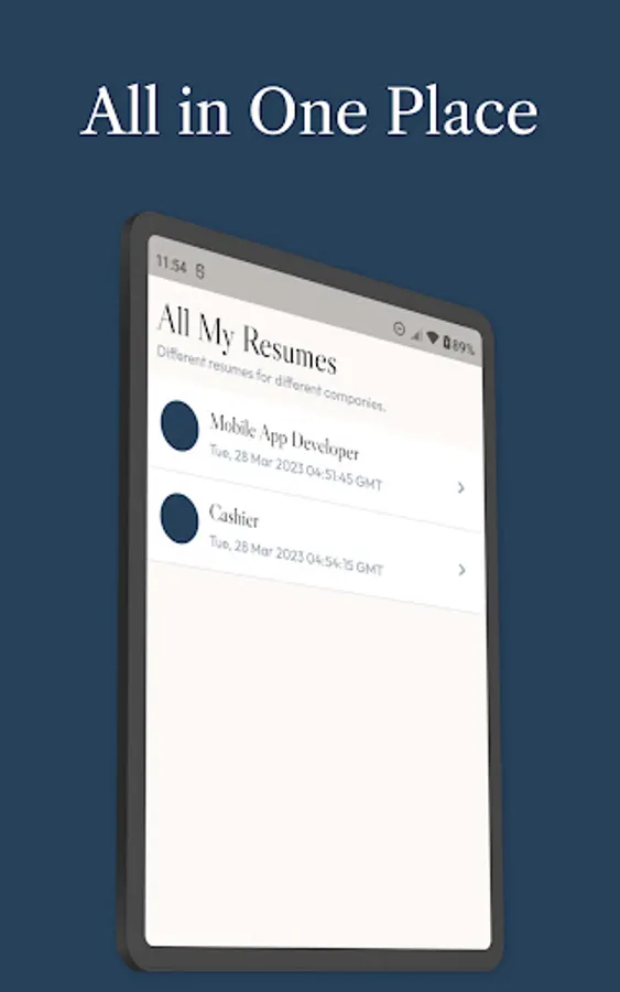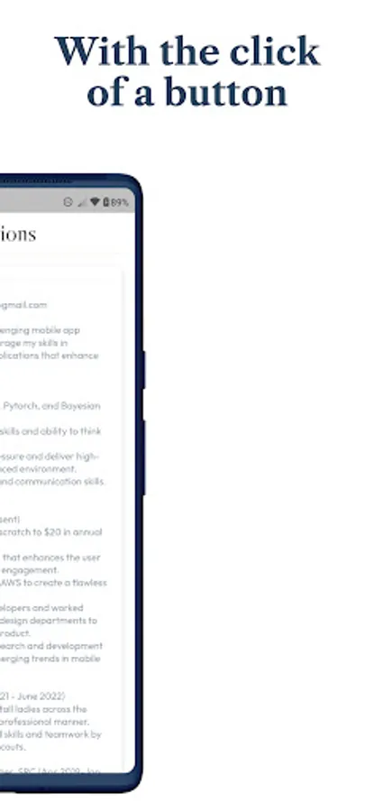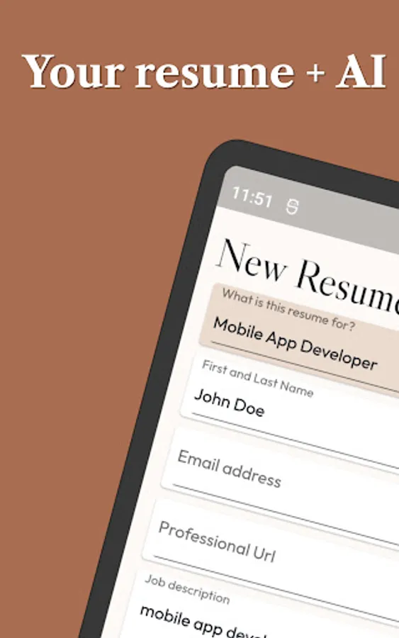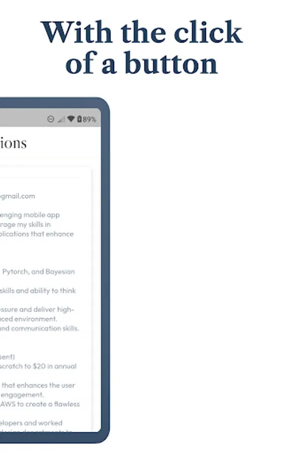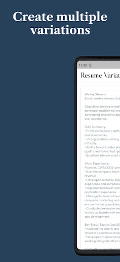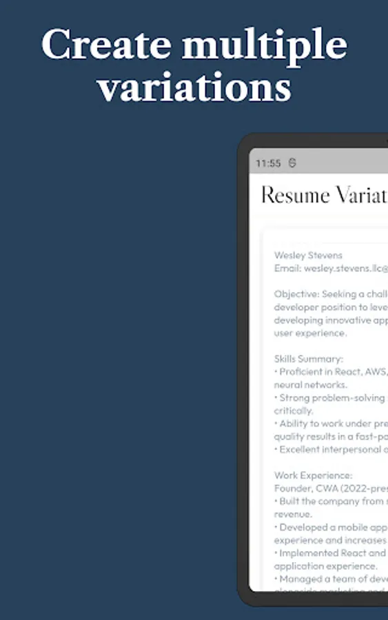 Our app uses cutting-edge artificial intelligence technology to analyze your work experience, education, and skills to generate a tailored resume that accurately reflects your strengths and achievements. Say goodbye to the frustration of writer's block and guesswork when it comes to crafting your professional image.