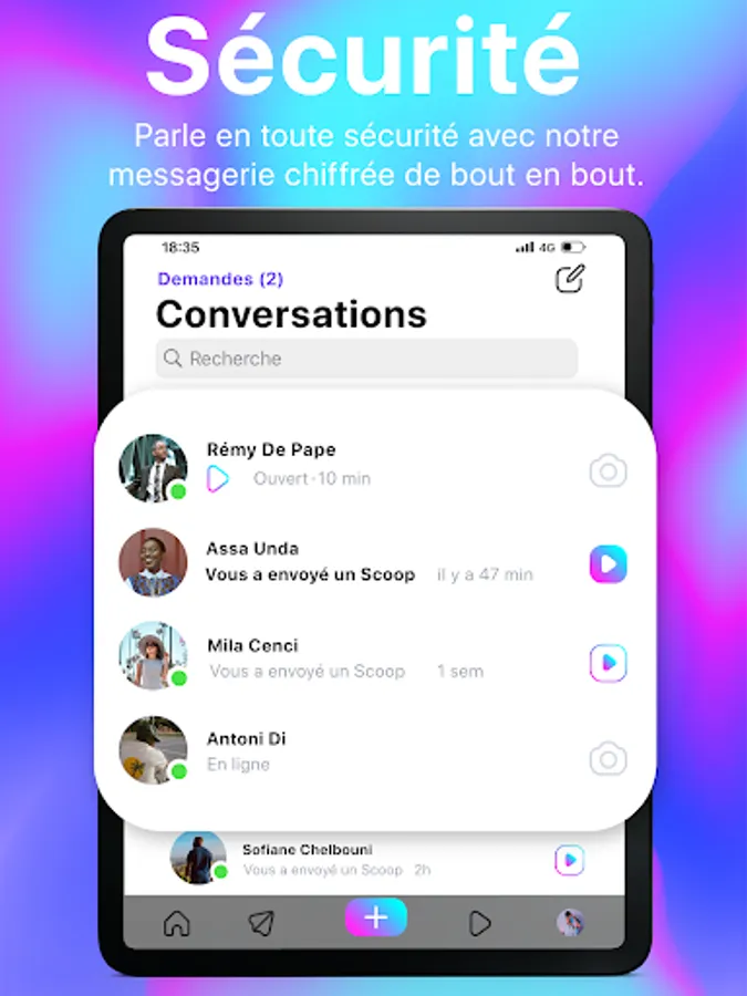 * We take your privacy seriously and never allow any third party to access your data. You can at any time delete any message sent or received by you and your correspondent without leaving a trace. WeScoop cannot read sent messages, photos and videos.