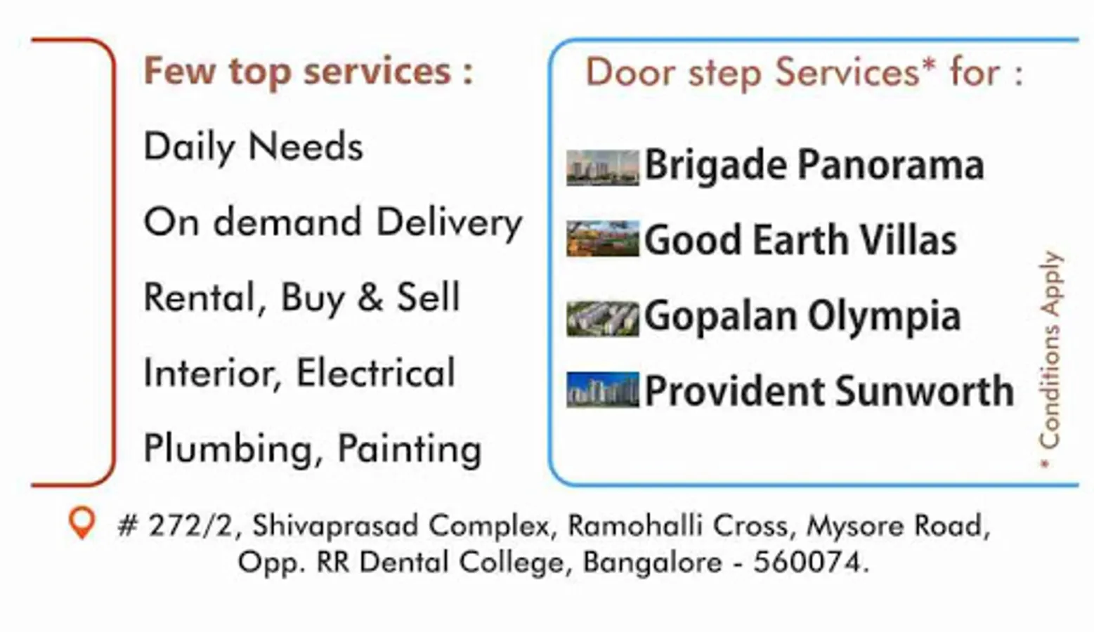 Currently we provide door step service for all you needs at Brigade Panorama, Good Earth, Gopalan Olypia & Provident Sunworth apartments in Bangalore, expanding rapidly to server the entire India. Contact for Franchiese.