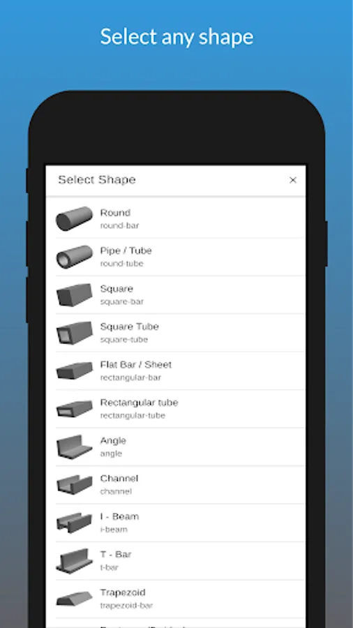 Round bar, Pipe, Square bar / Sheet / Plate, Square tube, I-beam, T-bar, Channel, Angle, Octagonal bar, Hexagonal bar, Pentagonal bar and Triangular bar