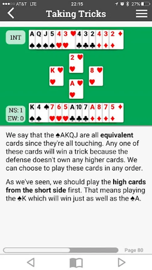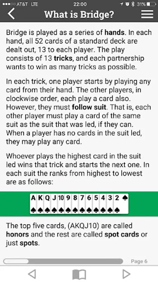 Start by learning the rules and basic cardplay techniques, then learn about what really sets Bridge apart from other trick-taking games: bidding back and forth with your partner to determine how many tricks you can take, and what the best trump suit will be.