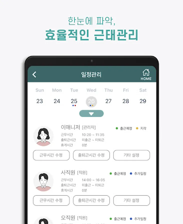 Receive notifications of employees' arrival, departure, and tardiness anytime, anywhere. T&A can be tracked even when the manager is not on site.