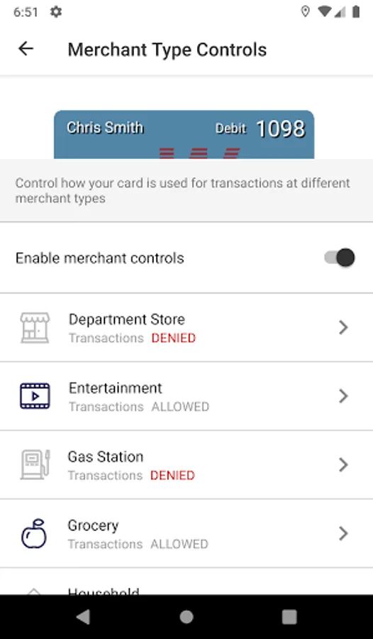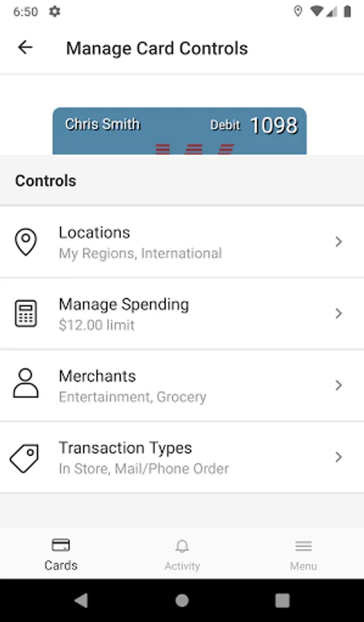Set spending limits to decline transactions above your thresholds. Monitor activity by category such as gas stations and restaurants, and by type: in-store purchases, e-commerce transactions and ATM transactions.