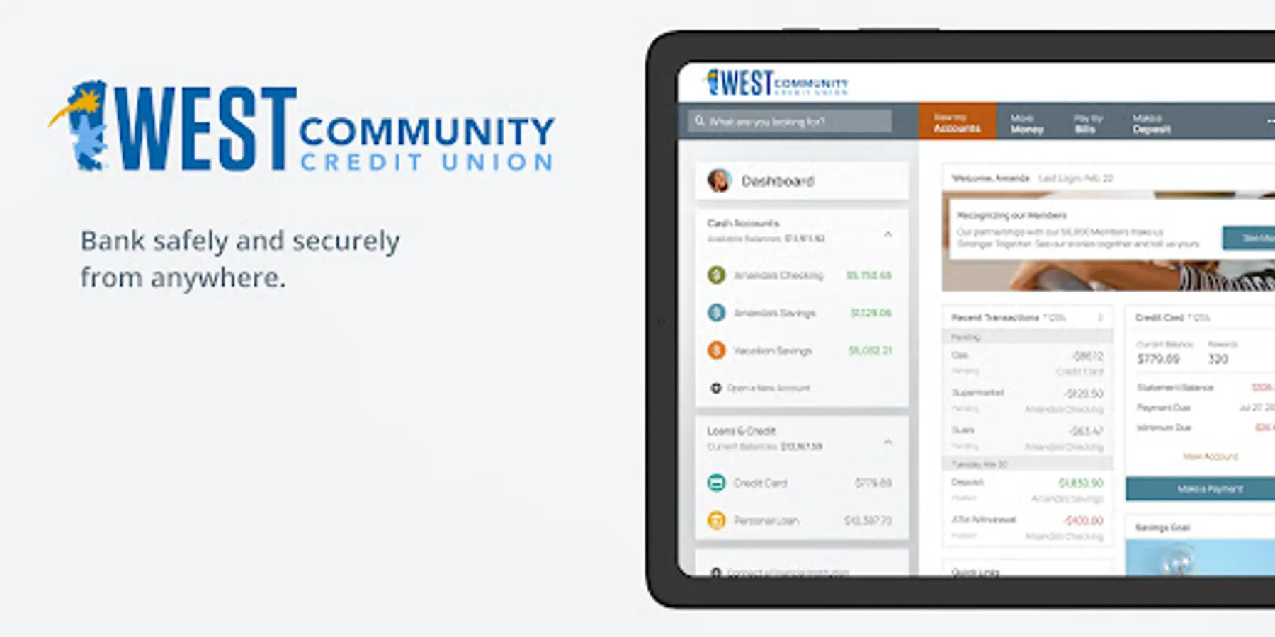 At West Community Credit Union, we believe in something bigger. Something that brings us all together. It’s the idea that we’re all connected, and that there’s a common good worth working for. We’re in the business of building relationships on trust, being honest with our members and treating everyone fairly. We care about our members and their goals, and we work hard every day to deliver an exceptional experience. That’s why we’ve developed a top-notch mobile app – because we believe in people, our members, and our community. We are West Community Credit Union, and we are banking on you.