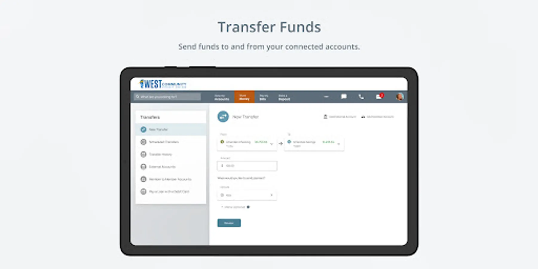 ● Transfer funds between all your West accounts, or externally to and from your outside accounts