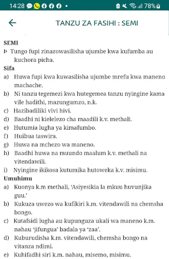 This study app is designed to help students and teachers study Fasihi Simulizi, which is the Swahili term for oral literature. The app provides a comprehensive and interactive approach to learning about this rich genre of literature by offering a variety of features.
