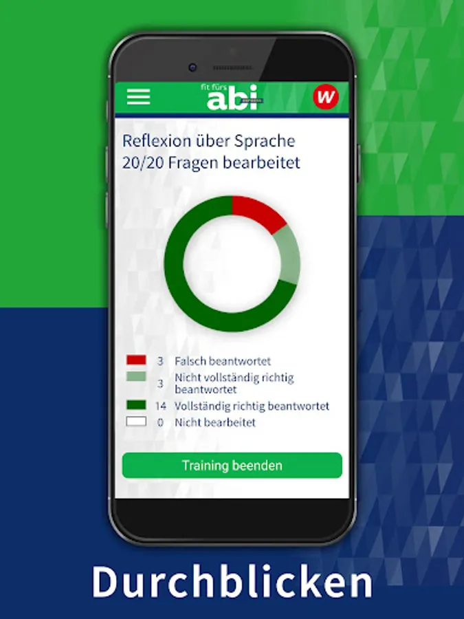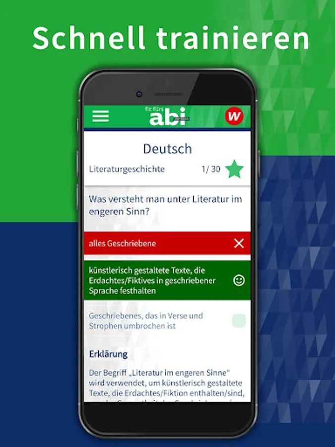 The app is the ideal addition to the book series "Fit fürs Abi Express", which prepares all important Abitur topics in a nutshell for the final spurt. The combination of app and book is the ideal solution for "Abitur late starters".