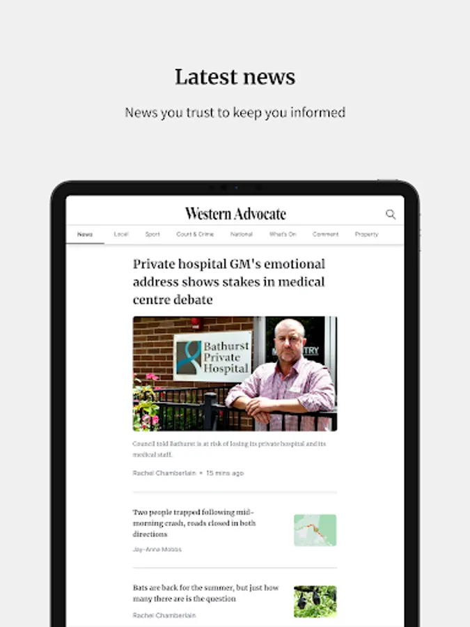 Whether it's the breaking news you need to know from around the region or across the nation, our dedicated crime reports, Bathurst Regional Council news, the latest Group 10 rugby league, Bathurst Orange Inter District Cricket, Bathurst Netball Association, Central West Rugby Union updates or any other local sporting results, in-depth analysis explaining the decisions and events affecting our lives, or incisive commentary, you will be the first to know using the Western Advocate app.